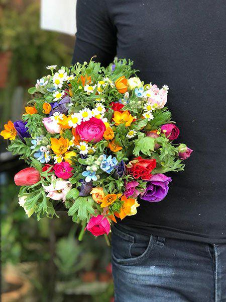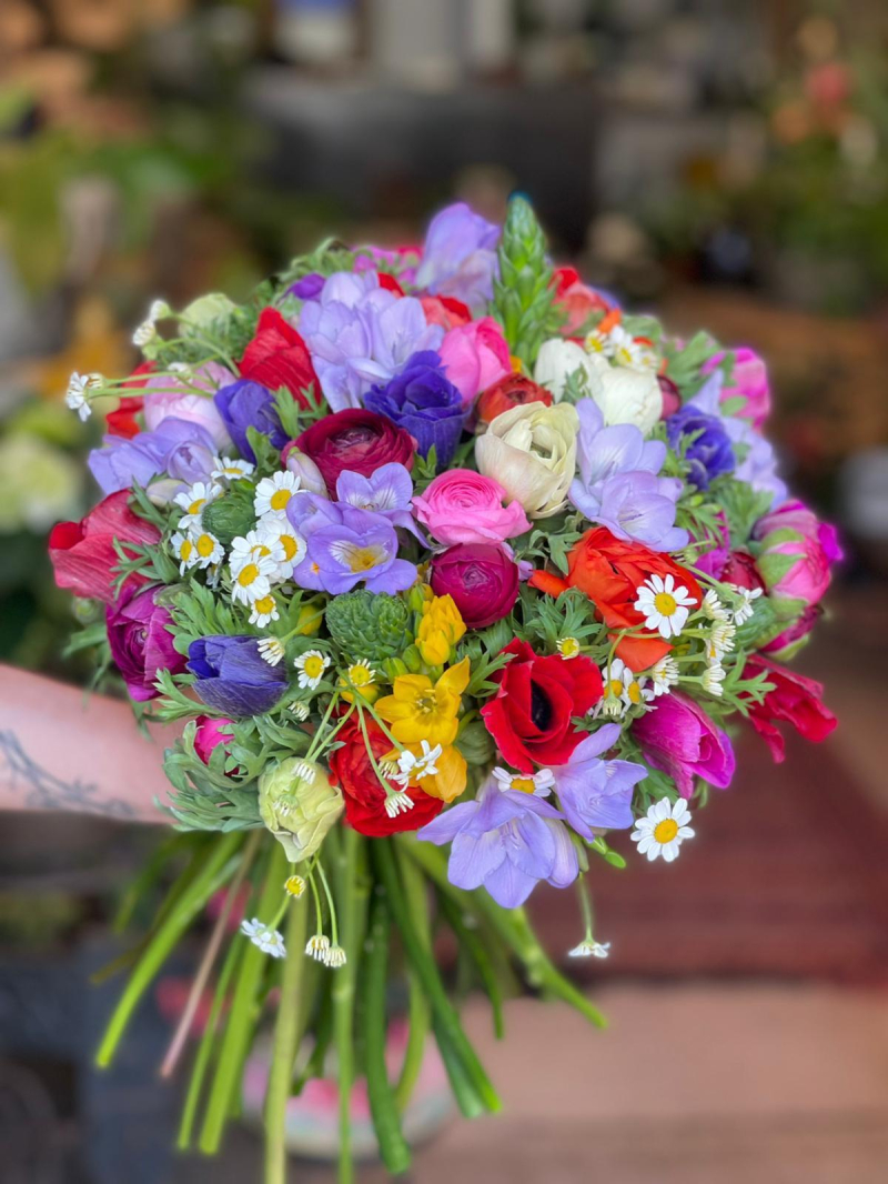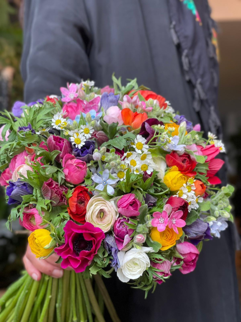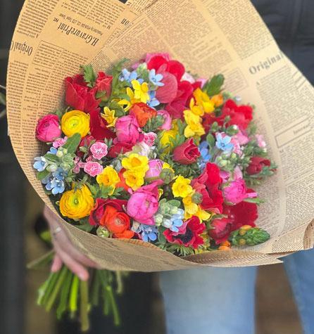 זר פרחים שזור ממגוון רחב של פרחי חורף (נוריות, כלניות, פרזיות, בבונג, טווידה, נרקיסים ועוד מגוון רחב – סוגי הפרחים משתנים ע”פ המלאי בחנות)